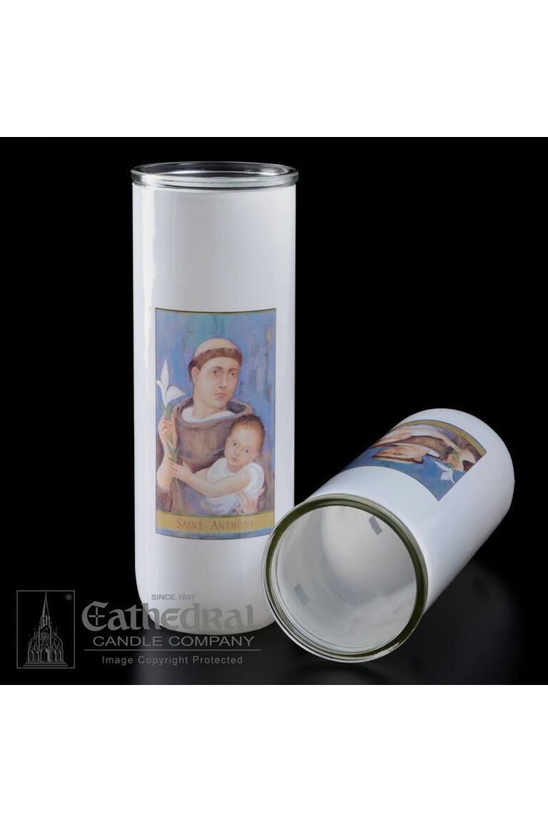 Unit price per5/6/7 day glass candle globes featuring Saint Anthony. Available by the case of 12