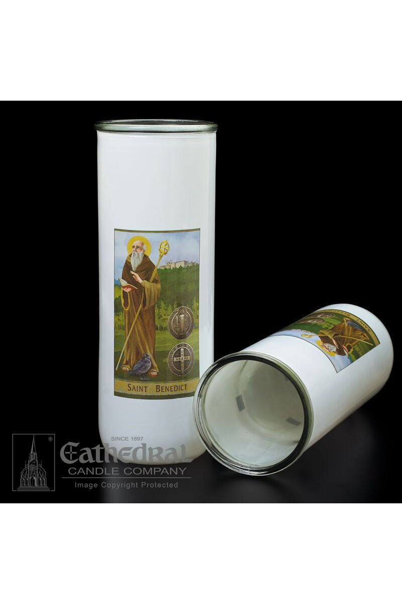 Unit price per5/6/7 day glass candle globes featuring Saint Benedict. Available by the case of 12