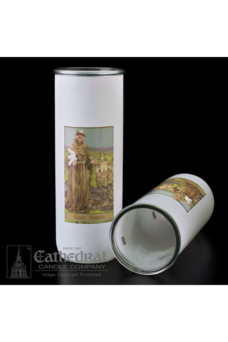Unit price per5/6/7 day glass candle globes featuring Saint Francis. Available by the case of 12