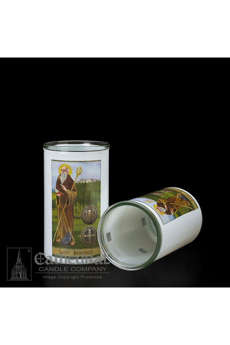 Unit price / per3 day glass candle globes featuring Saint Benedict. Available by the case of 12