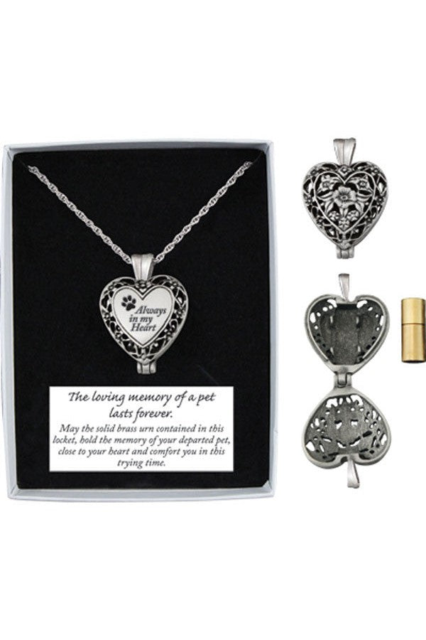 Unit price perAlways in My Heart Pet Memorial Locket on a 24" chain. Beautiful touch for any Animal Lover in a 5" x 4" box with message card.