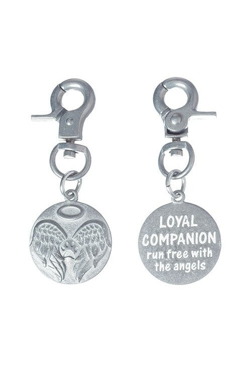 Unit price per3" pet memorial charm with the words "Loyal companion run free with the angels" on the back. On the front there is a halo and wings around a paw print. The charm is made from zinc alloy and is lead free.
