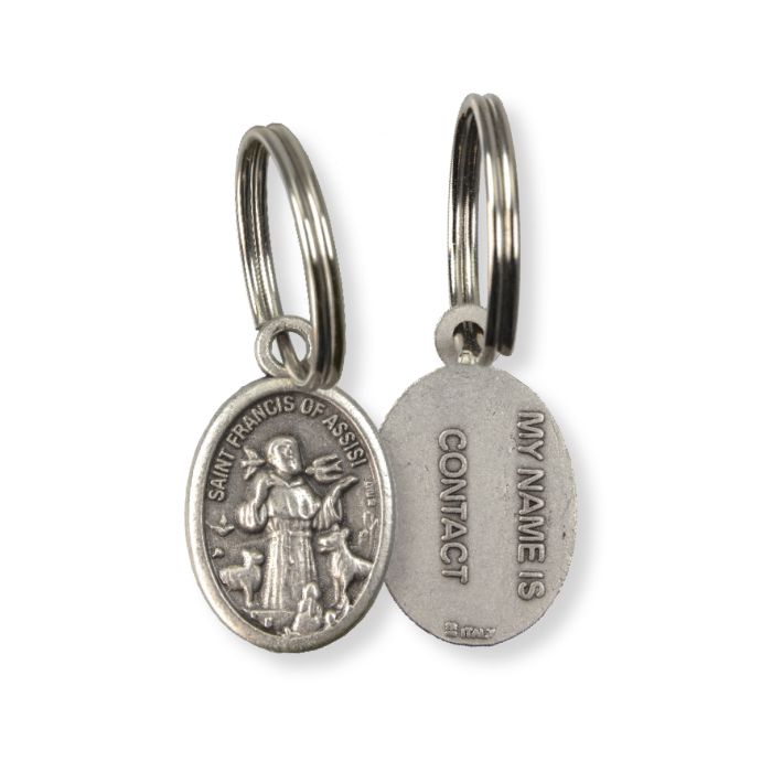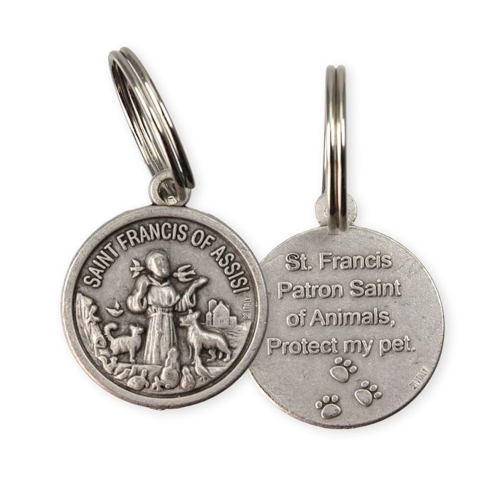 Unit price perThis is a great gift for pet lovers! This pet medal is shaped as a paw with Saint Francis of Assisi with a dog and cat. The medal reads Saint Francis of Assisi Protect My Pet.