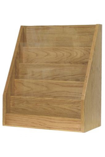 Pamphlet Rack #AI1047 is made of solid oak. Finished. Choice of 16 wood finishes. Pamphlet rack has five levels. Overall size27" width x 10" depth, 23" height. Made in the USA.