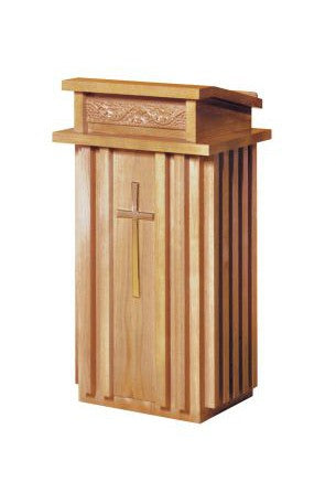 Unit price perLectern #AI740 is made of solid oak. Lectern has one inside shelf. Lectern has wood slats on front. Overall size 27" wide x 20" depth, 46" height. Choice of 16 wood finishes. Made in the USA.