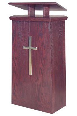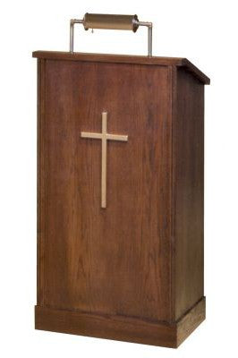 Unit price perAdjustable Lectern #AI327 - Made of solid oak. Lectern has an adjustable angled top. Lectern has one inside shelf and a cross on the front. Overall size Top: 18" wide X 15" depth, Adjusts from 42" to 48" height. Choice of 16 wood finishes. Please note: Actual finished pieces will exhibit some variation in grain and tone due to the natural characteristics of wood and no guarantee can be made of an exact match.