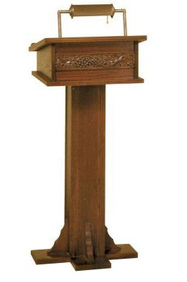Unit price perLectern #AI6020 - Made of solid oak. Lectern has aangled top and has one inside shelf. Lectern has wheat & grape banding on the top. Overall size:20" wide x 19" depth, 45" height. Choice of 16 wood finishes. Made in the USA.