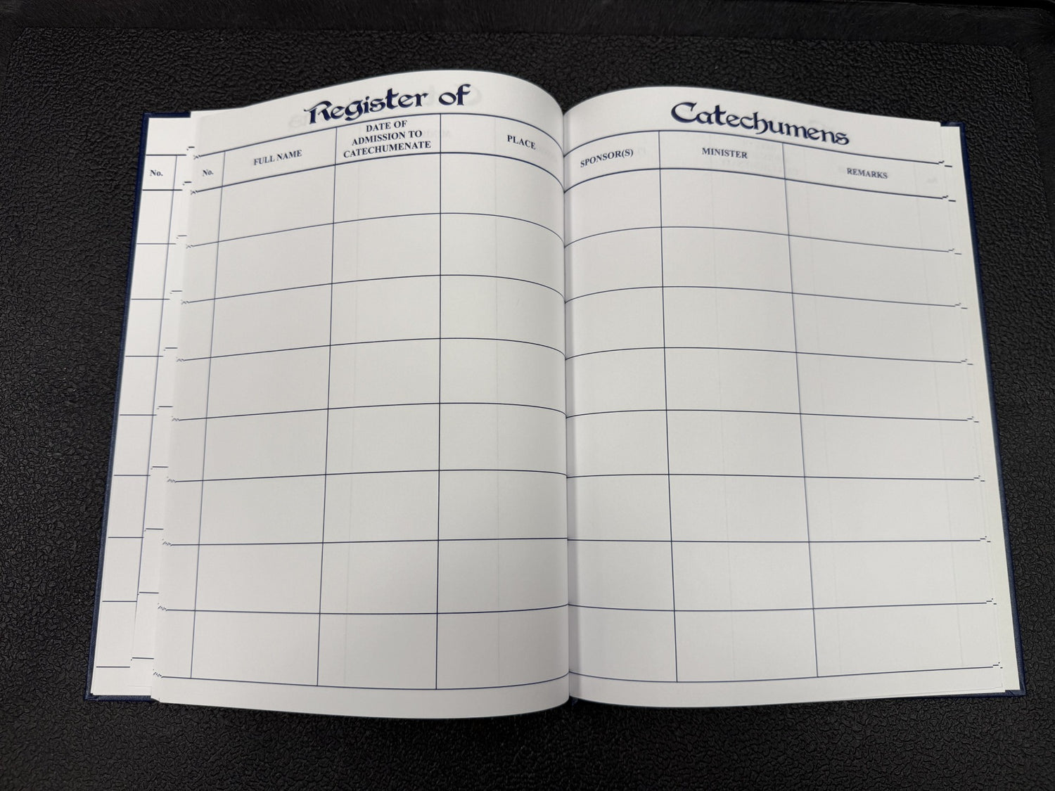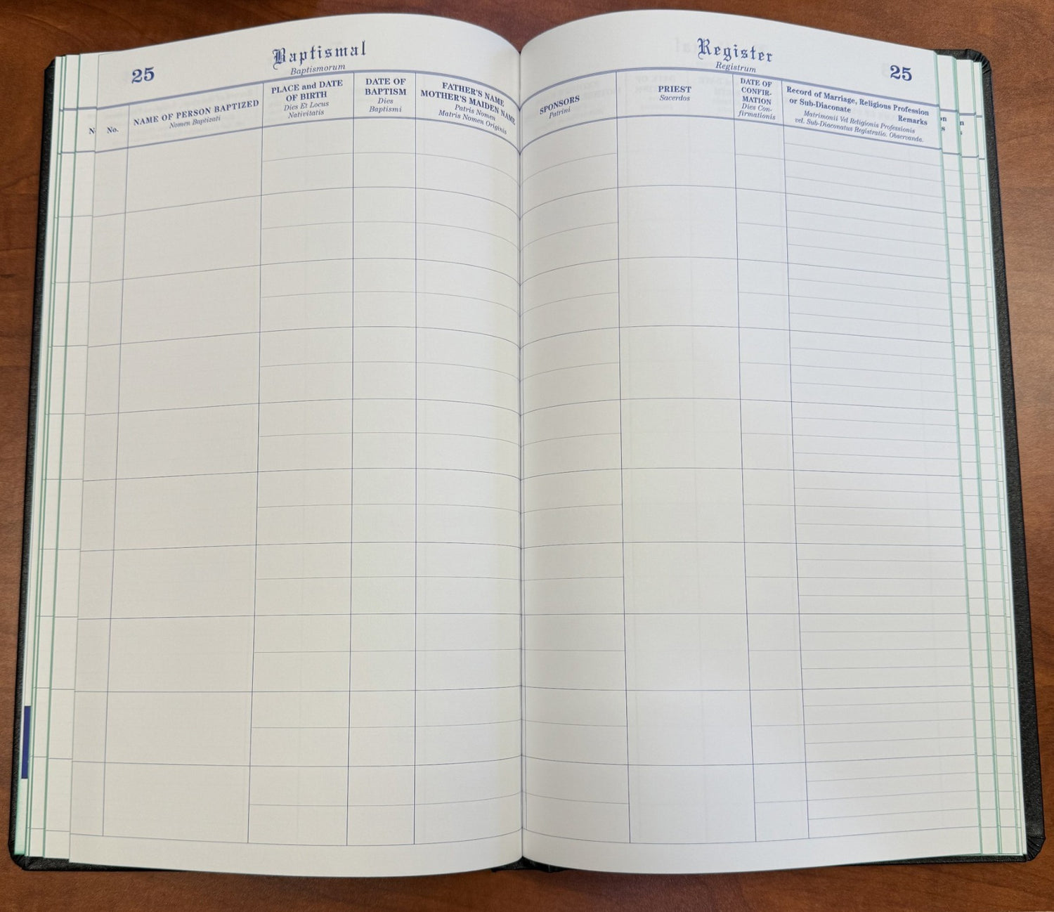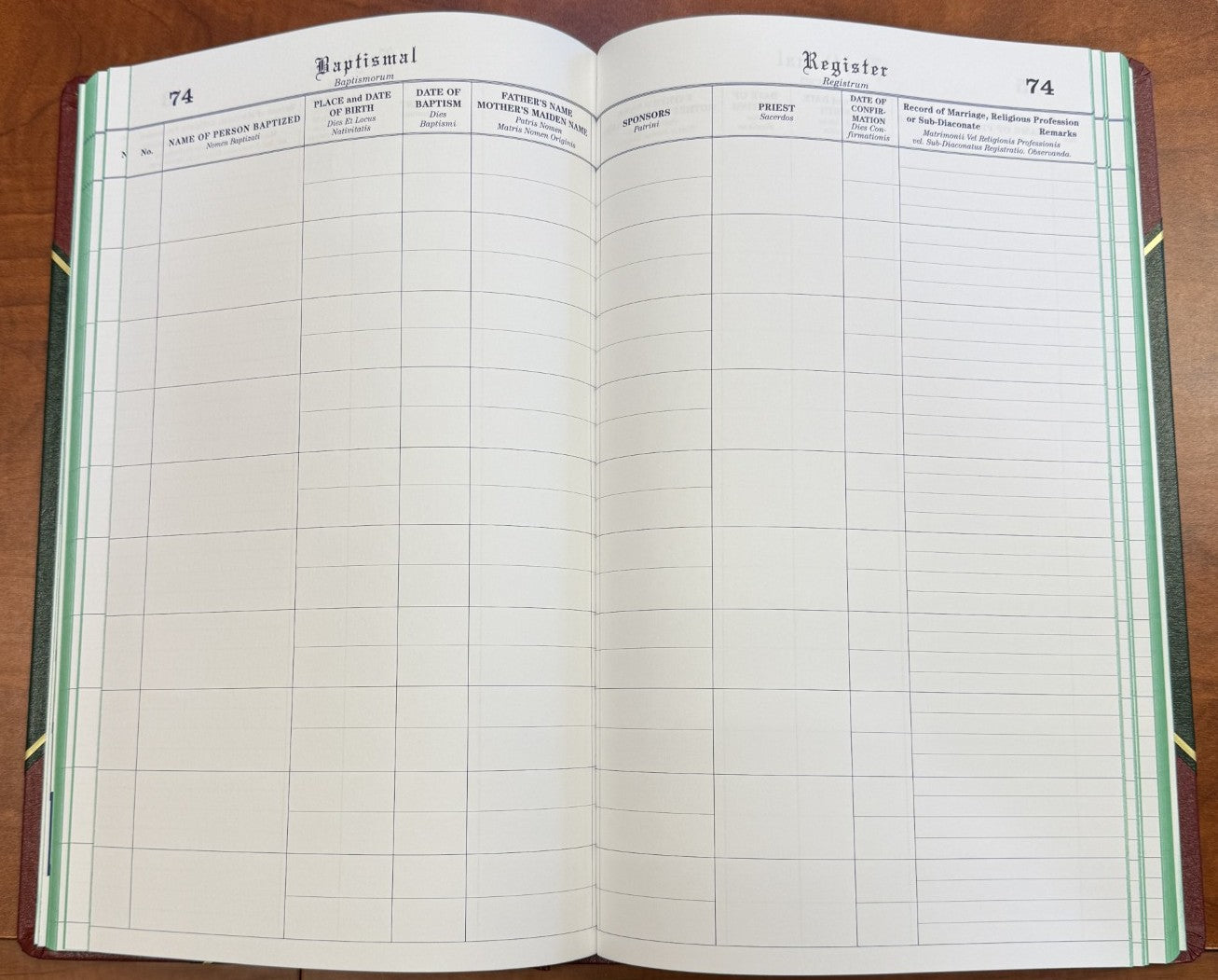 Standard Registers are recommended for the average parish. These 100 page, 9"x 14" books are hand bound with green Spanish grain sides, red sturdy flex corners and back, gold titled and tooled. All Church Record Books are indexed and have printed numbered pages. Holds 2000 entries.