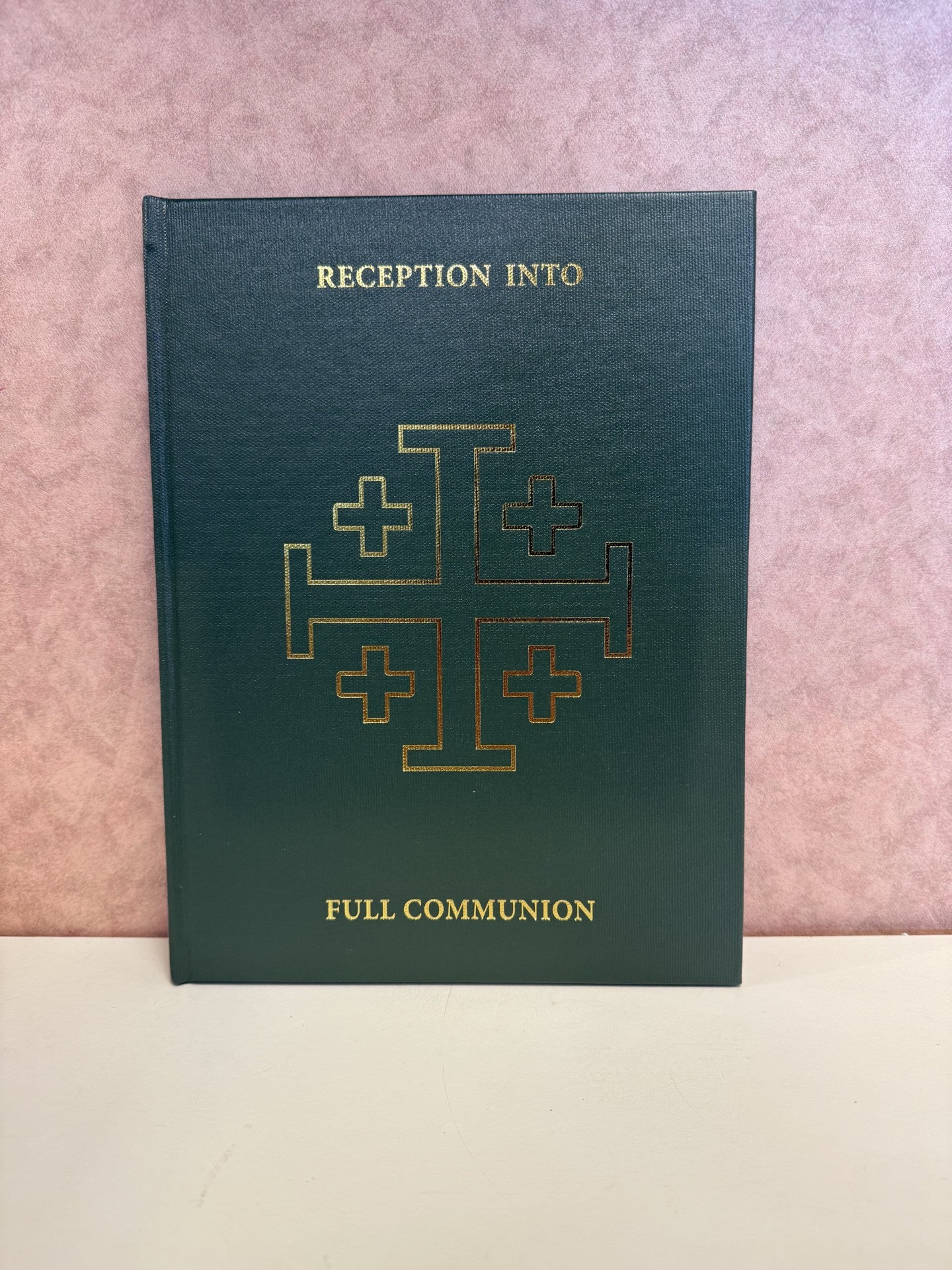 Handsomely bound in green imitation leather. Front cover is stamped in gold with a 4" Jerusalem cross.