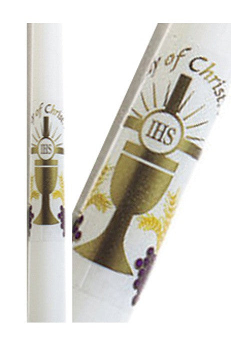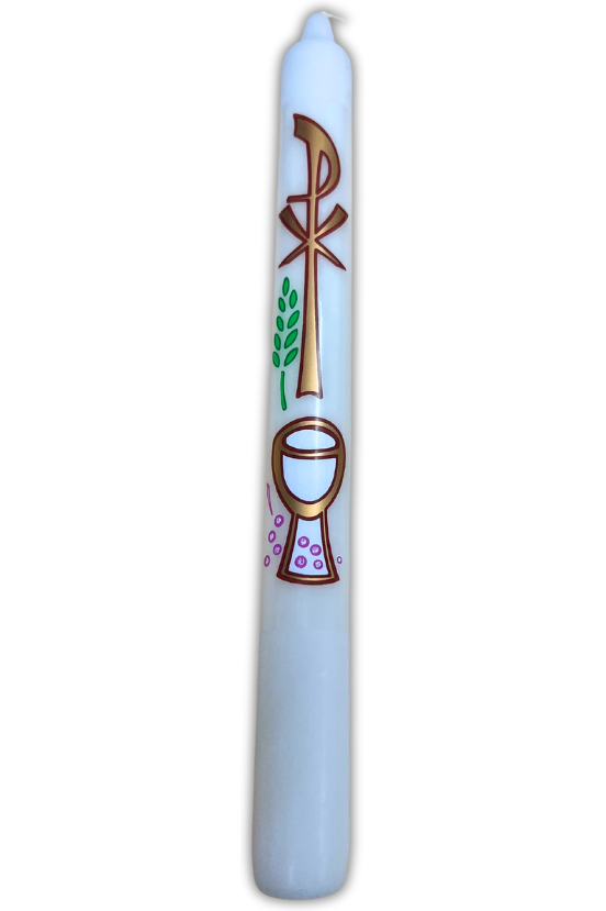 Unit price perThis candle is beautifully decorated with the symbols of communion: wheat, grapes, host, and chalice.