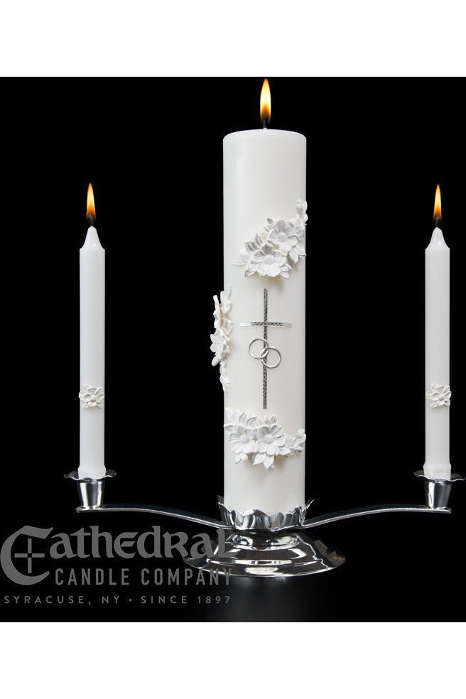 Unit price perUnity Candle set of 3 candles w/ Silver stand. Candle features cross, heart, doves and rings.