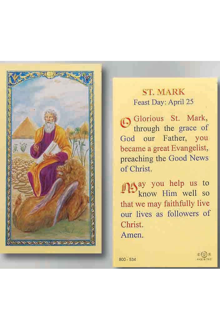 Unit price perDurable and everlasting laminated holy prayer card that contains a color image of St Mark on the front, and a Prayer to St. Mark Feast Day April 25 on the back. Card measures 2 1/2" x 4 1/2".
