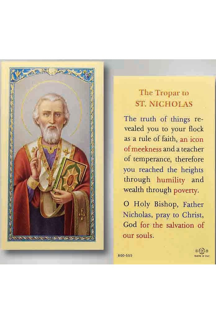 Unit price perDurable and everlasting laminated holy prayer card that contains a color image of St. Nicholas on the front, and the Tropar to St. Nicholas on the back. Card measures 2 1/2" x 4 1/2".