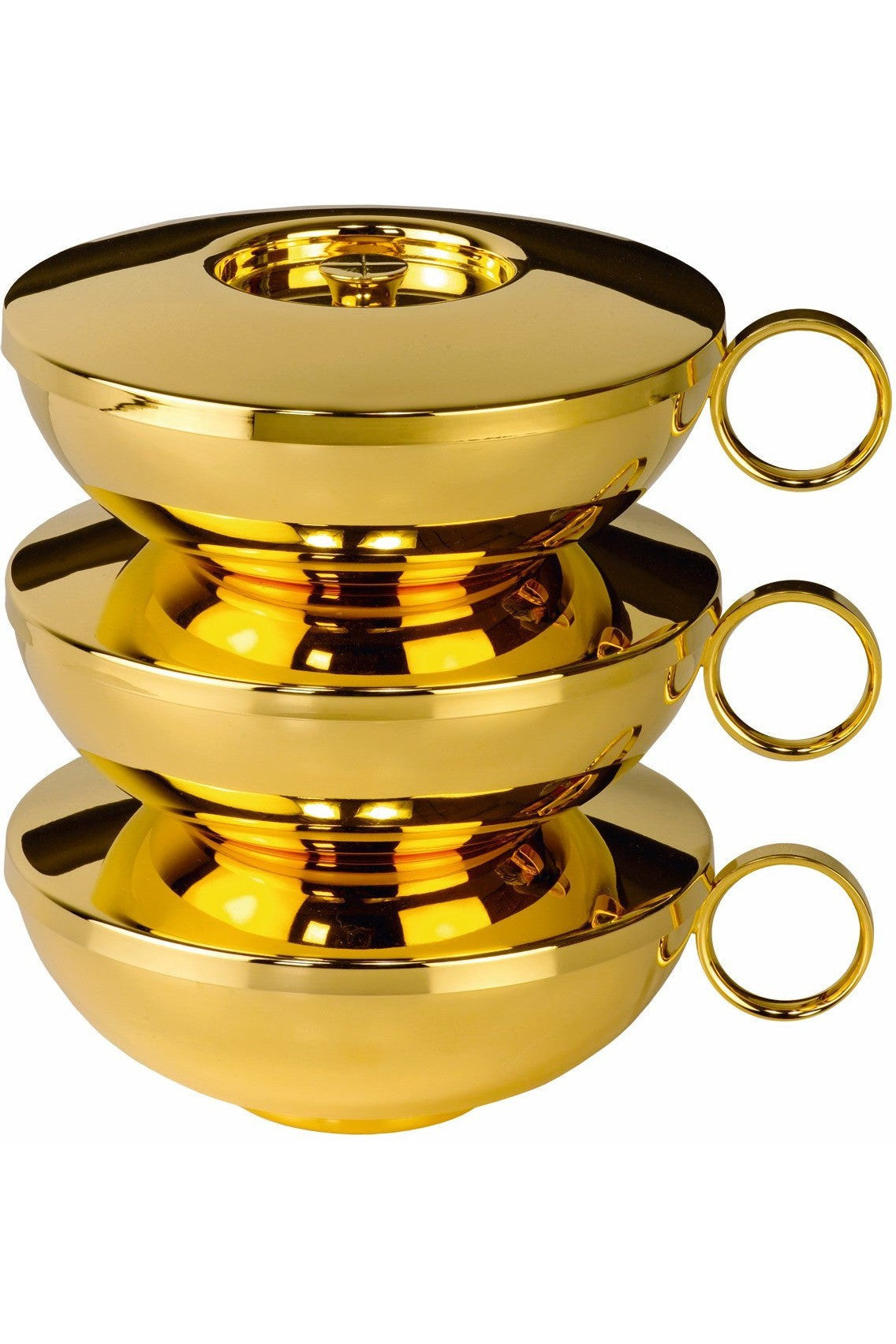 Unit price perHigh polished 24kt gold plated stacking ciboria. Host capacity of each bowl is 275. Set Ht. 8 1/2". Piece w/cover Ht. 2 3/8". Piece without cover Ht. 2 1/8". 6 1/8" bowl dia. 24kt gold plate. Made in the USA. All ciborium have a high polished inside finish unless noted. All host capacities are based on 1 3/8" communion breads. Shown as 3 pieces.