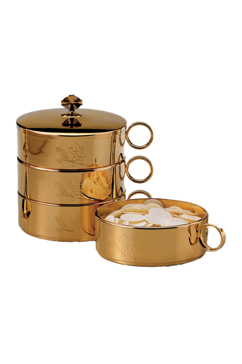 Unit price perThese stacking ciboria are sold individually. Each ciborium is gold plated with hand-engraved wheat and grape motifs, matching chalice EW1816 (see below). The lids are sold separately.