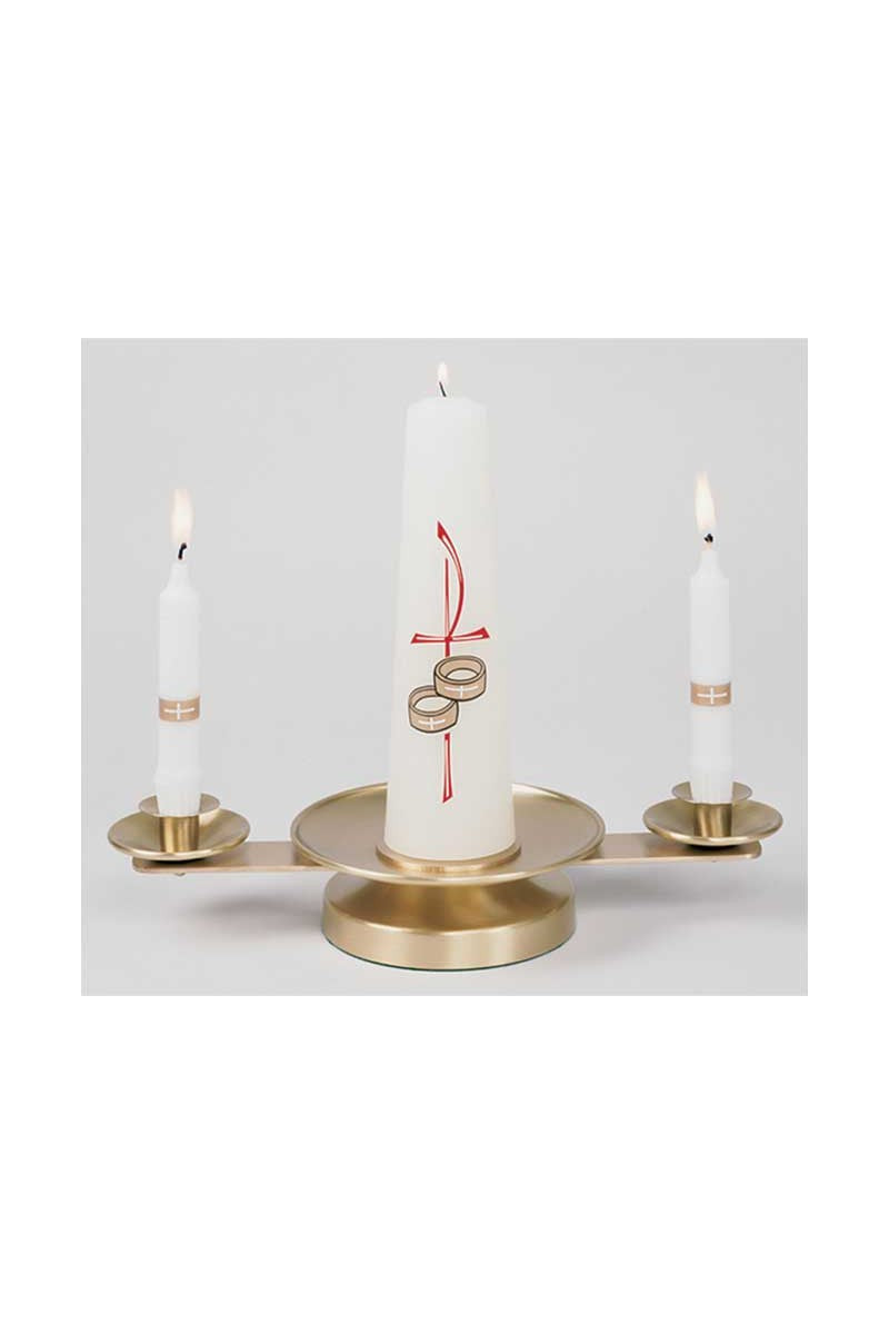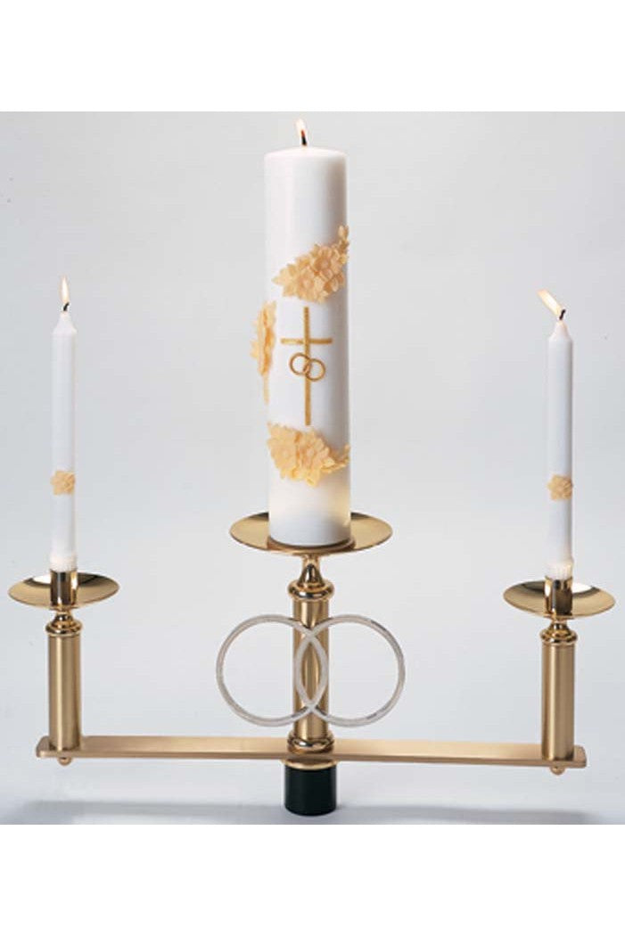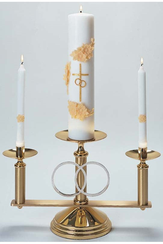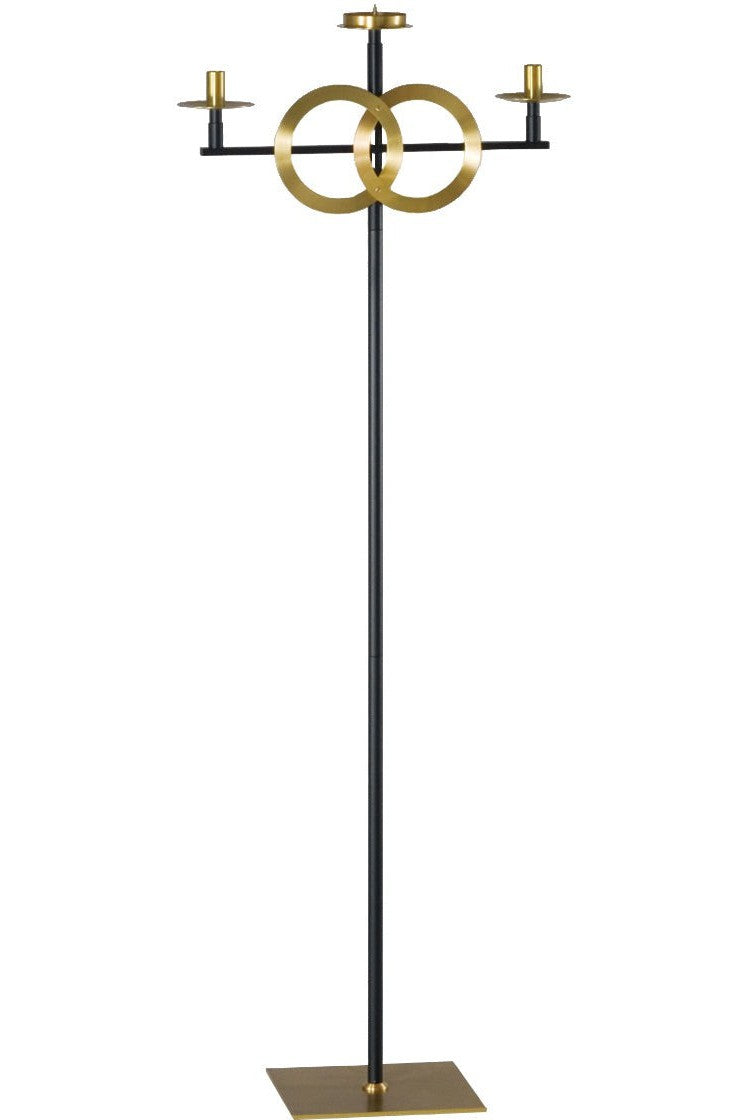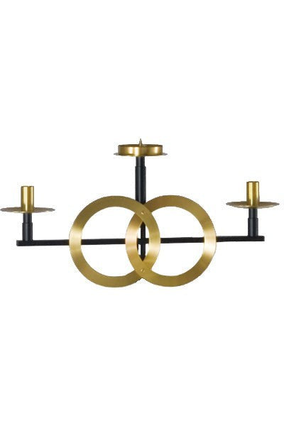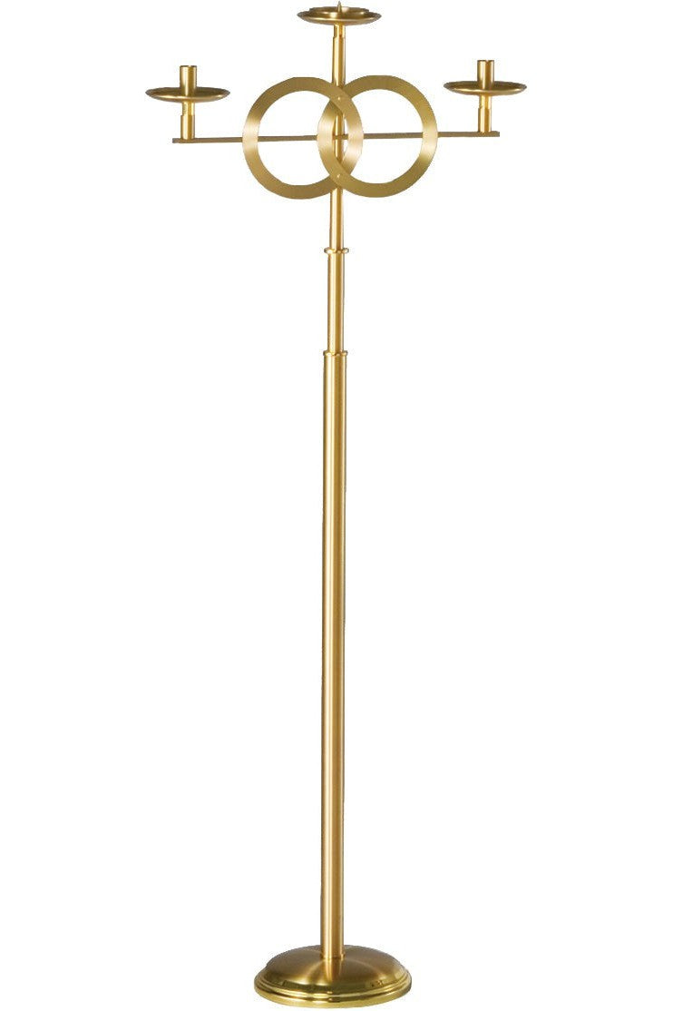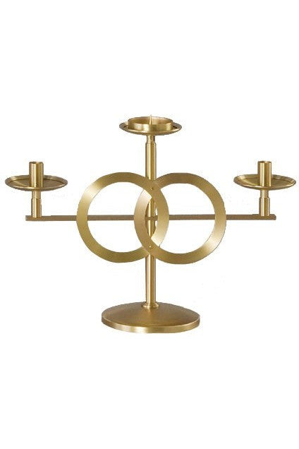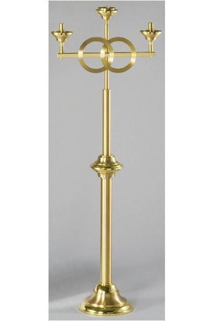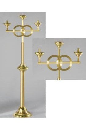 Unit price perSolid brass. 50" H. x 22" W. 12" weighted base. Center adapts to any candle. Silver plated rings, 7/8" sockets. Side candles removable for lighting. Candles not included.