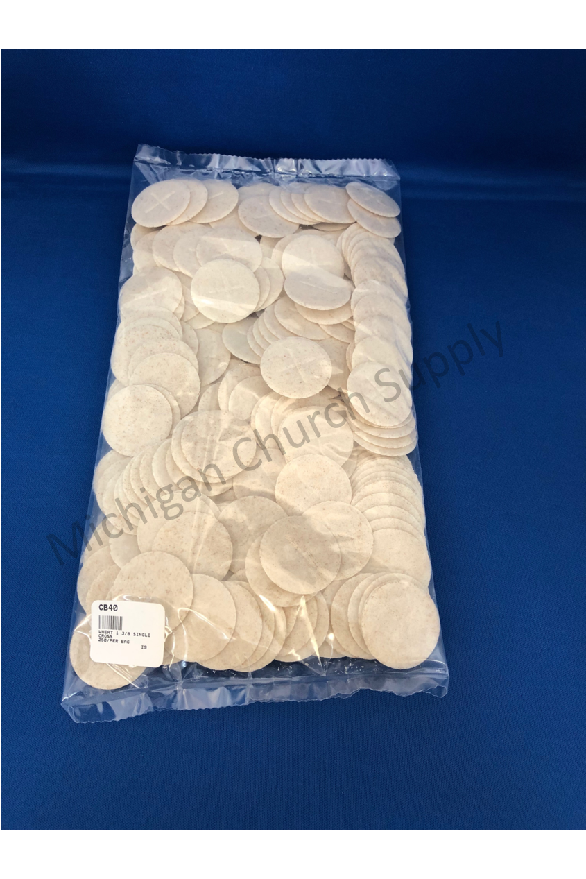 Unit price per1-3/8" Whole Wheat wafer/host with single cross design, packed in a clear poly bag , 250 per bag
