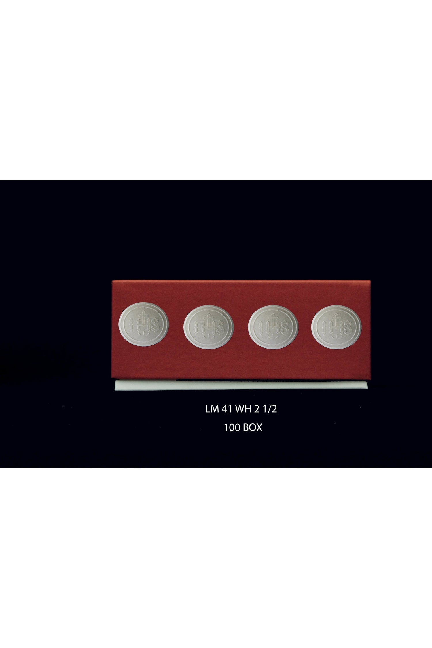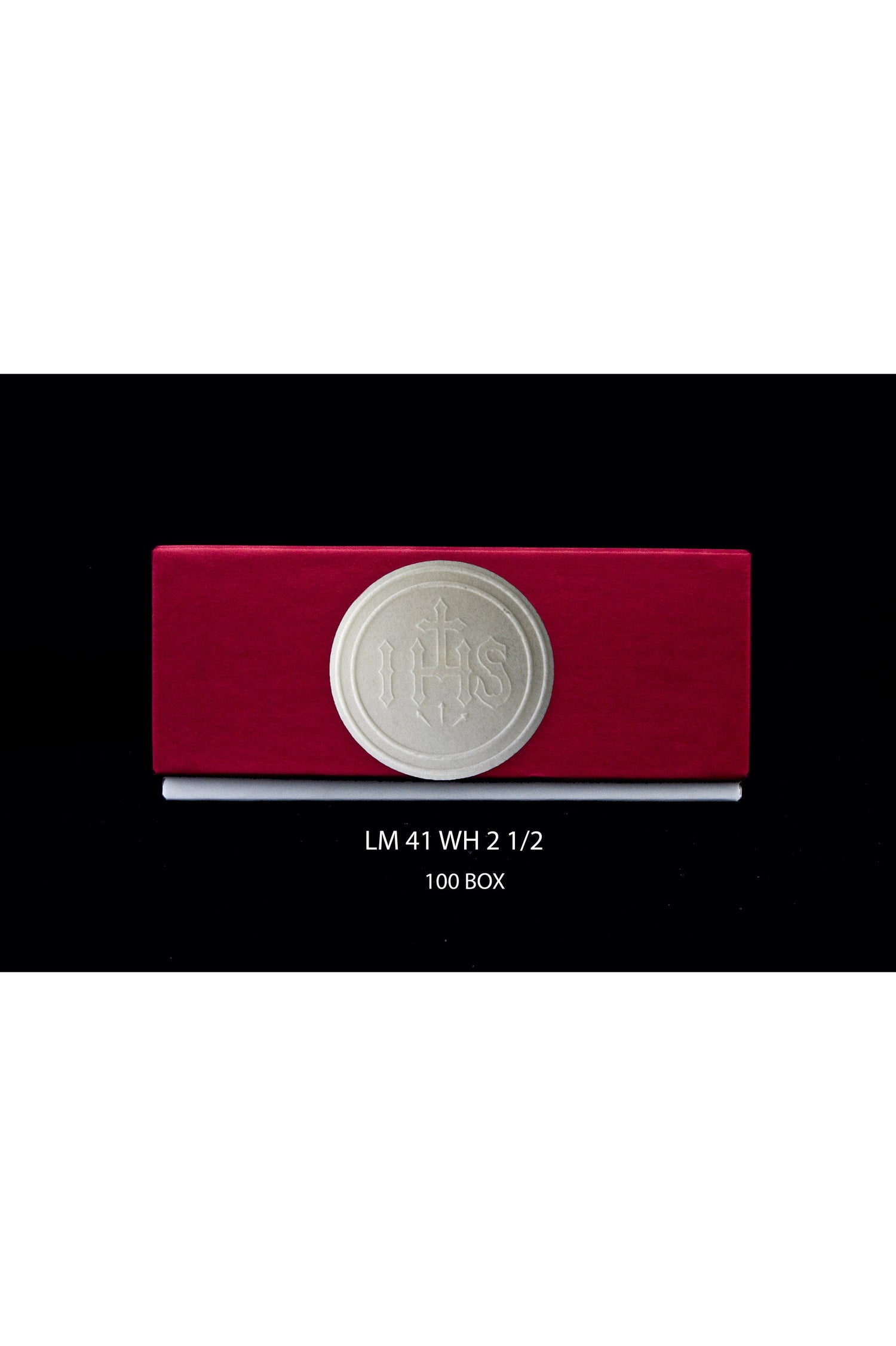 Unit price per2-1/2" Whole Wheat wafer/host with IHS design, packed in boxes of 50 red box. Special size to fit most monstrance. No more cutting down to fit your luna.