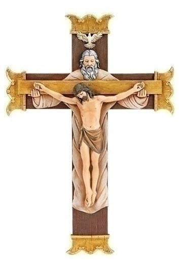 Unit price per10.25" x 7" Holy Trinity crucifix that is made out of resin/stone mix.