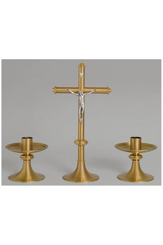 Unit price perAltar Crucifix with 6" Antique Silver Corpus (INRI) on a 6" base in Cast Satin Bronze finish with polished accents. 19" height. Pair of Candlesticks 4-1/4" height with 4" diam. Bobeche and 7/8" candle sockets on a 3" base in Satin Bronze with polished accents.