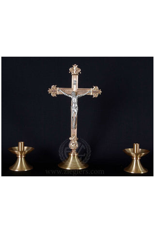 Unit price perCast Bronze Altar Cross with 6" Antique Silver Corpus (INRI) on a 6" base in Satin Bronze finish with polished accents, 19" height. Pair of Candlesticks 4 1/4" height to bobeche lip, 4" bobeche on a 3" diam. base with 7/8" sockets. Satin bronze finish with polished accents.