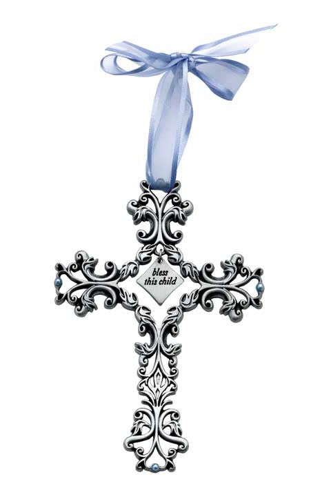 Unit price / per5" Bless this Child Filigree Metal Cross with Blue Ribbon.