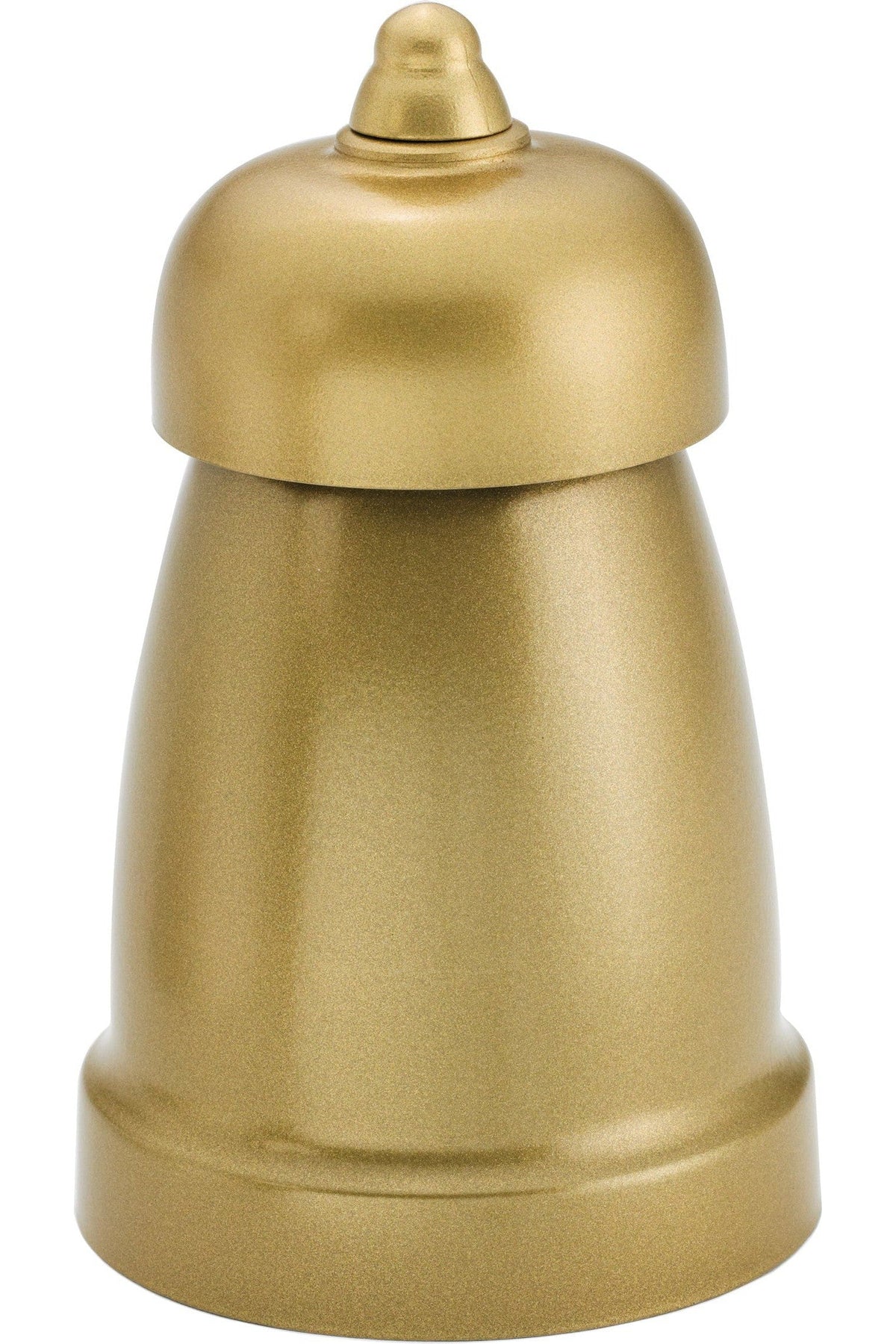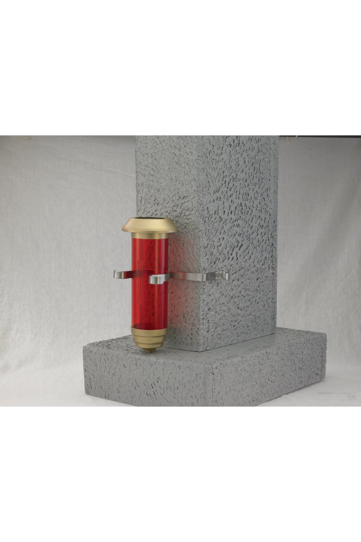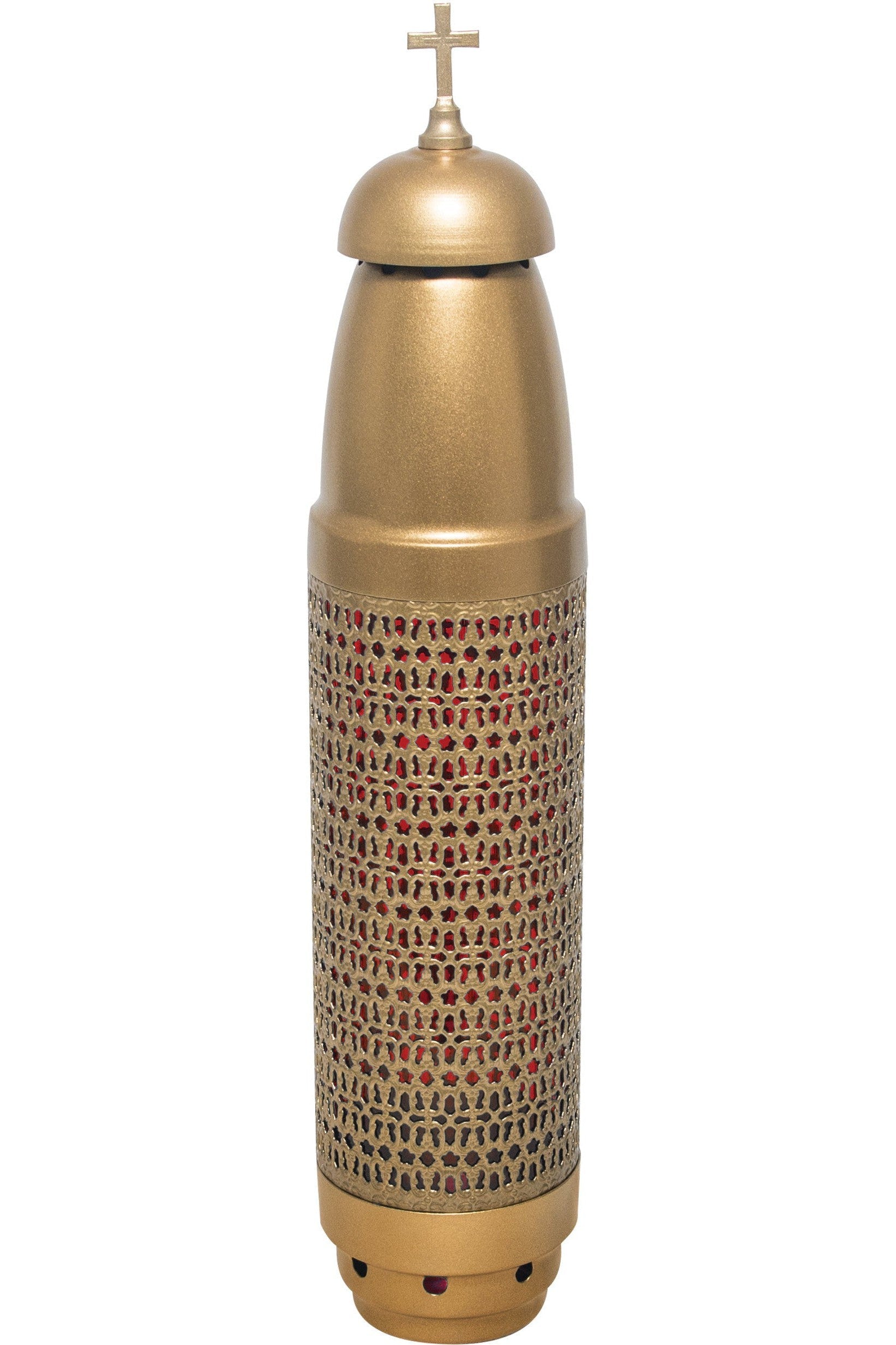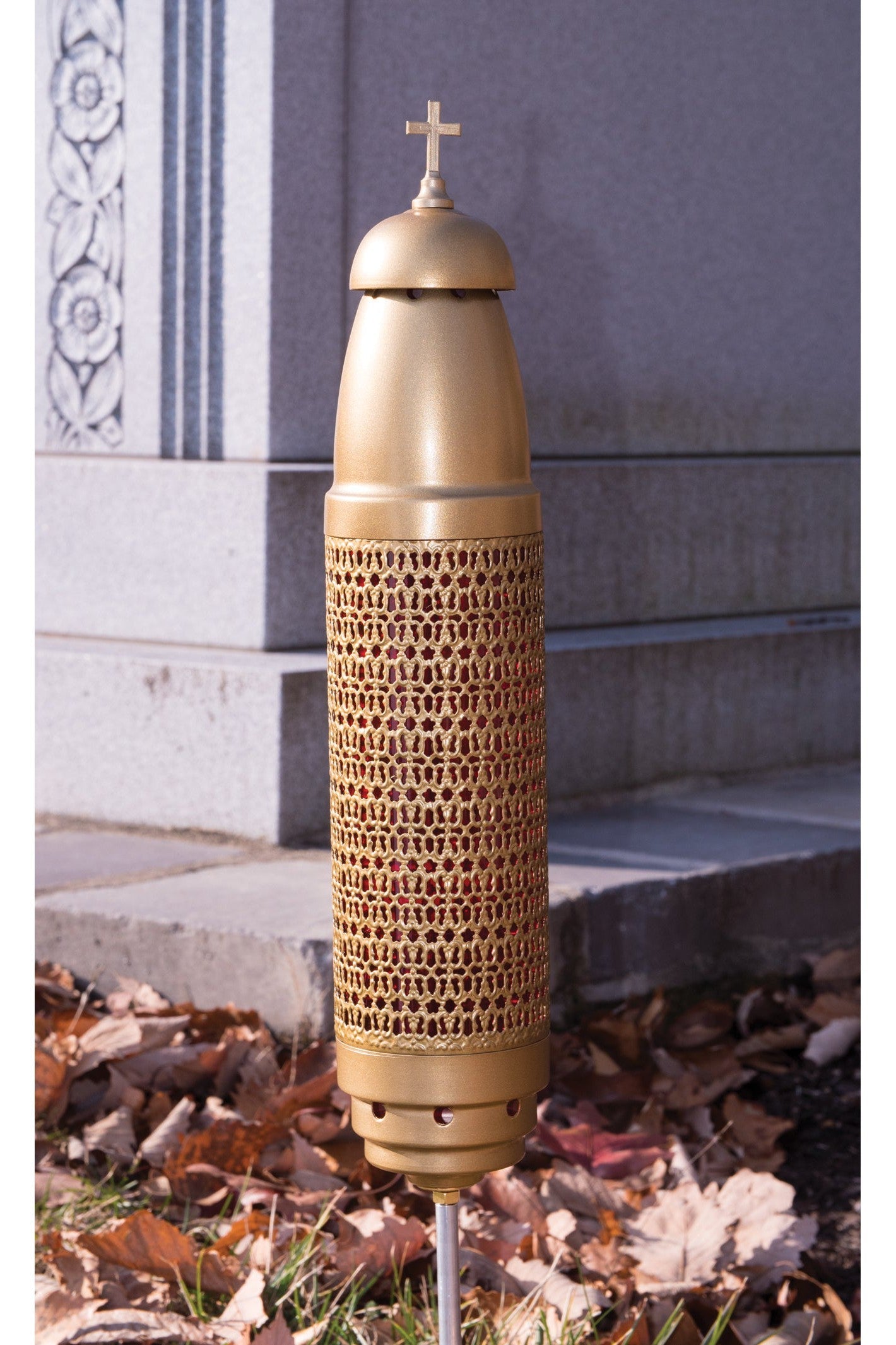 Unit price perHt. 18 3/4". Powder coated for outside durability. Decorative Filigree Design. Gold w/red or blue globe, please specify which color. Holds 7 day candle. GS-1 ground stakes included, AL-1 mounting bracket for walls optional. Also available with cap without cross. Made in USA.
