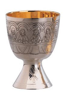 Unit price perThis contemporary chalice features a hand engraved Last Supper with the 12 apostles design on the cup and minimal Chi-Ro symbol on the base. The inner cup is gold lined, and the rest of the chalice is finished in silver plate, lightly oxidized to enhance the design.