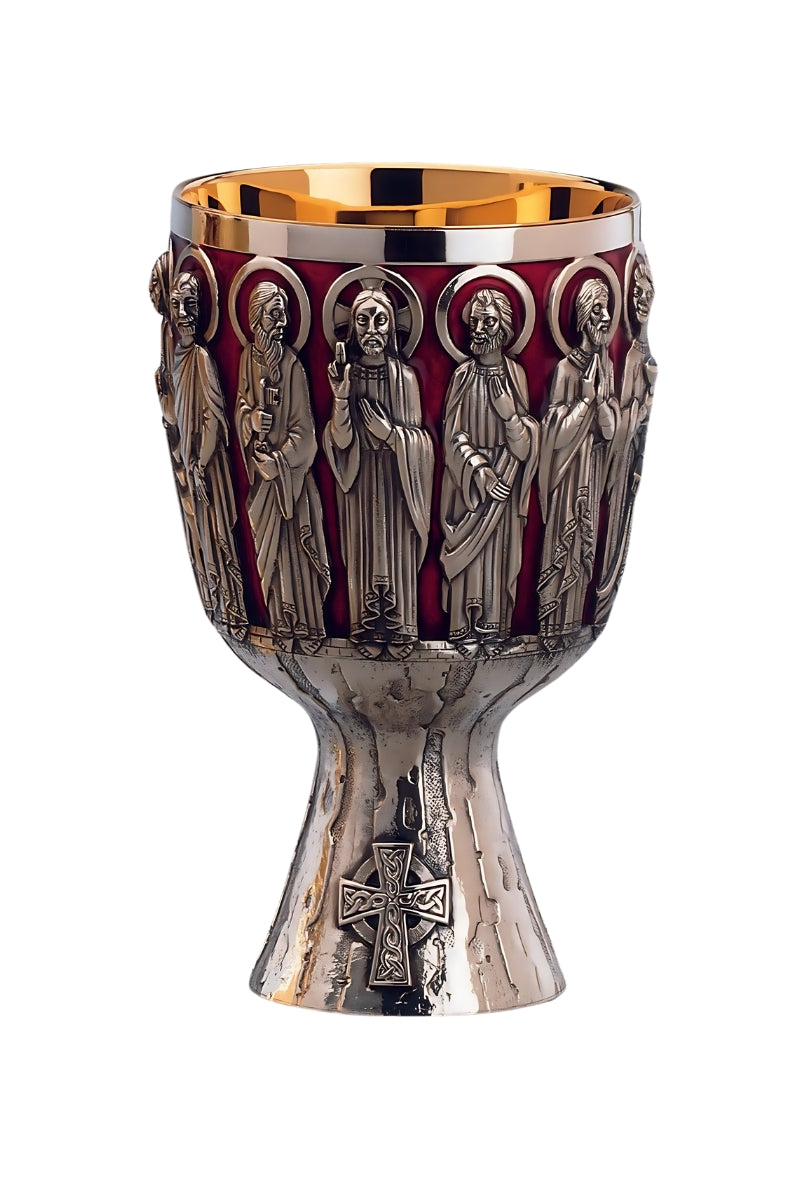 Unit price perThis contemporary chalice features repousse relief work of Christ and the 12 apostles at the last supper on a red enameled background around the cup. The base is textured with engraved lines and set with a Celtic cross. The chalice is silver plated with a gold lined inner cup. Includes a 6" bowl paten (not pictured).
