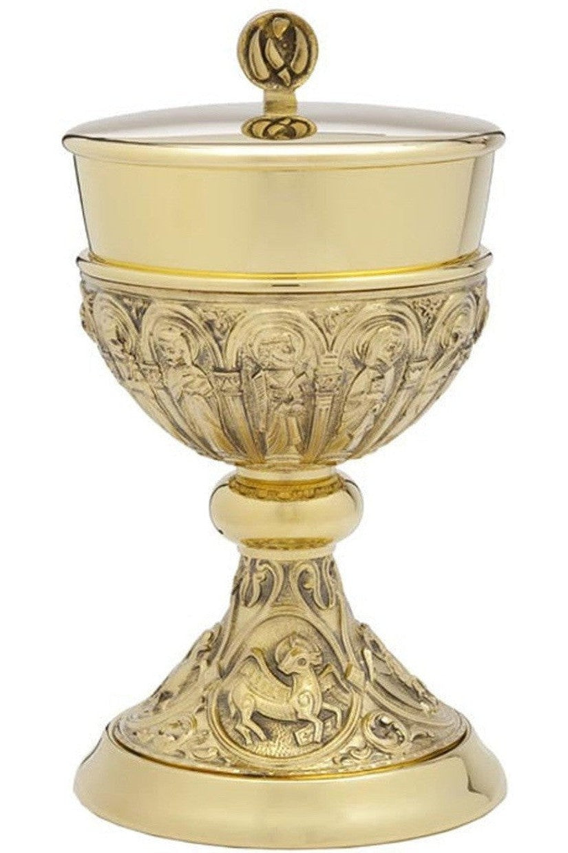 Unit price perHost 175. Ht. 8 1/4". 24kt gold plate. Made in the USA. All ciborium have a high polished inside finish unless noted. All host capacities are based on 1-3/8" communion breads.