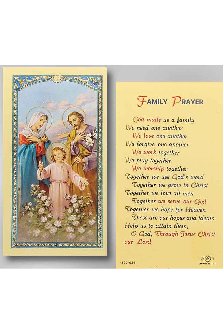 Durable and everlasting laminated holy prayer card that contains a color image of The Holy Family on the front, and a Family Prayer on the back. Card measures 2 1/2" x 4 1/2".