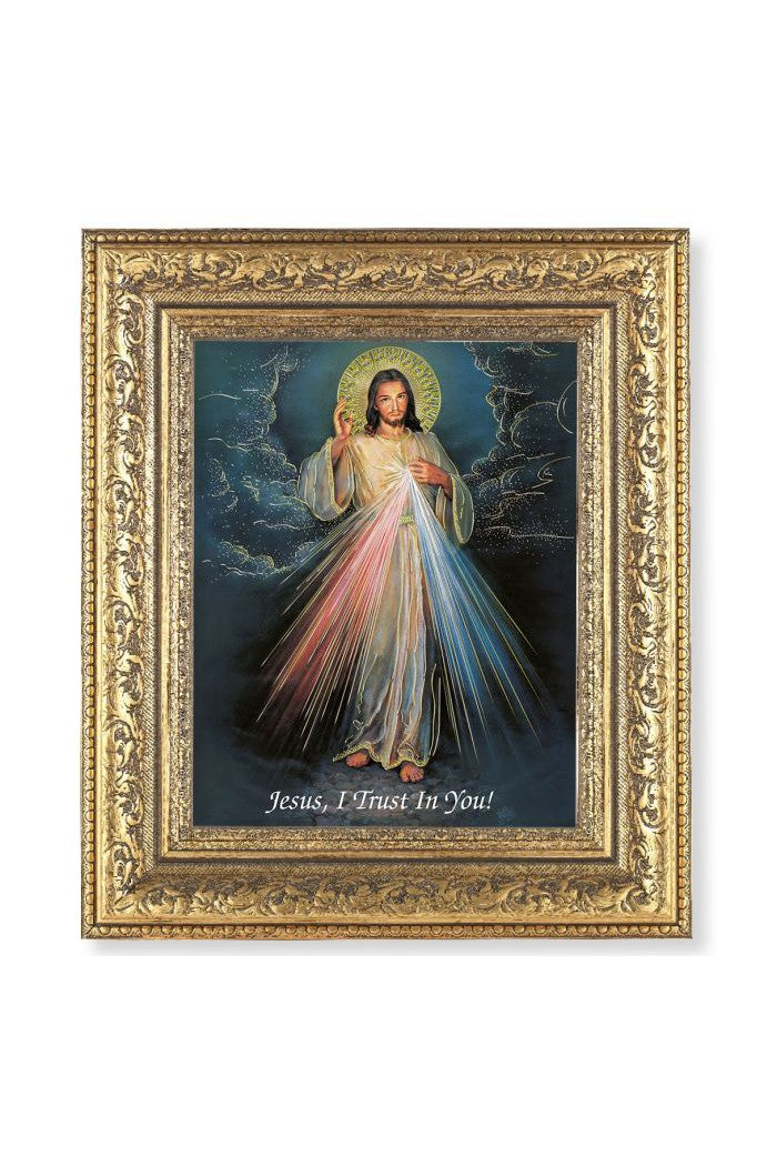 Large, quality framed Catholic art at an affordable price! This Gold-Leaf Ornate Frame has our exclusive, fine Italian 'Fratelli Bonella' gold-stamped Italian lithograph of the 'Divine Mercy', with the words 'Jesus I Trust In You'. This quality fine art is under glass, with a velvet back and easel, giving this framed art a luxurious look.