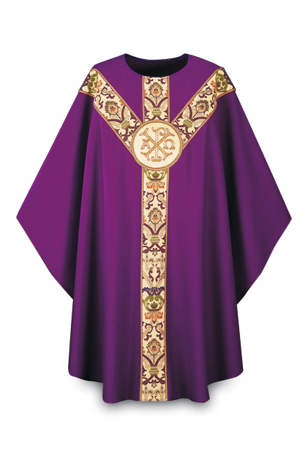 Unit price perGothic Chasuble inDupion - 30% viscose 70% polyester. Color-Purple. Neck-Plain. Length 49", Width 59", with inside stole.