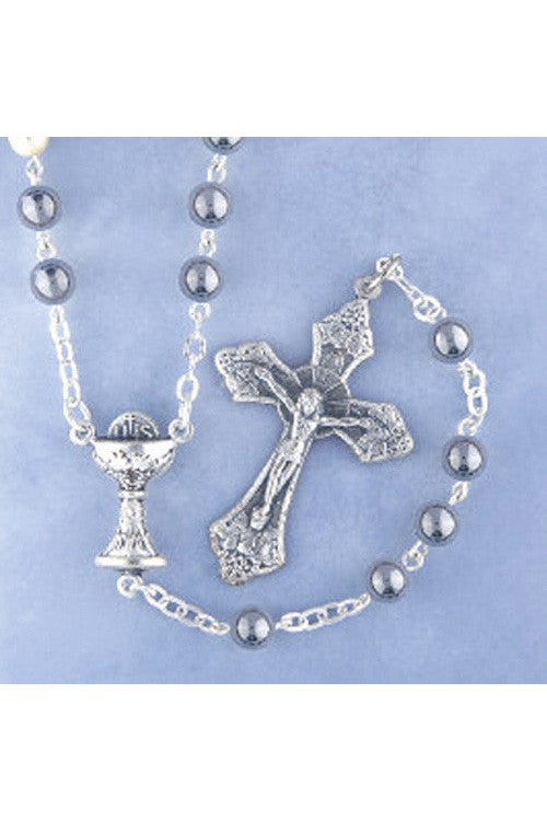 Unit price perRound imitation hematite rosary with oxidized crucifix and chalice centerpiece.