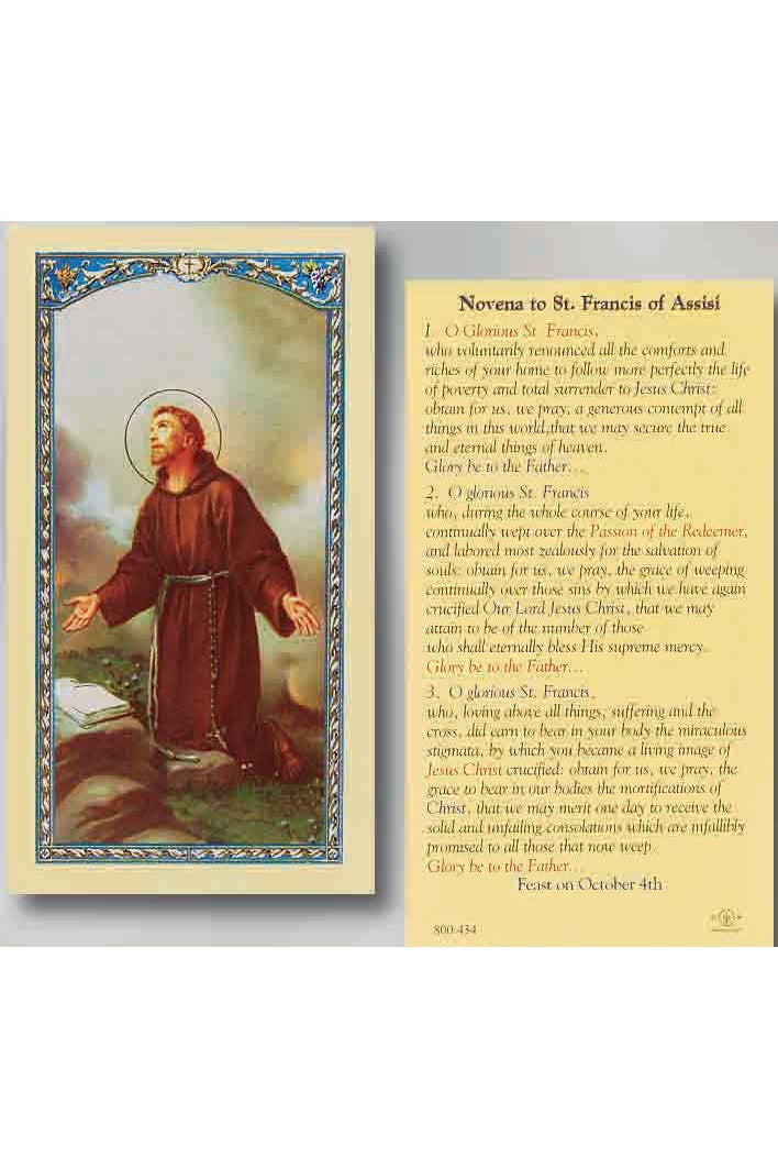 Unit price perDurable and everlasting laminated holy prayer card that contains a color image of St.Francis of Assisi on the front, and a Novena Prayer to St.Francis of Assisi on the back. Card measures 2 1/2" x 4 1/2".