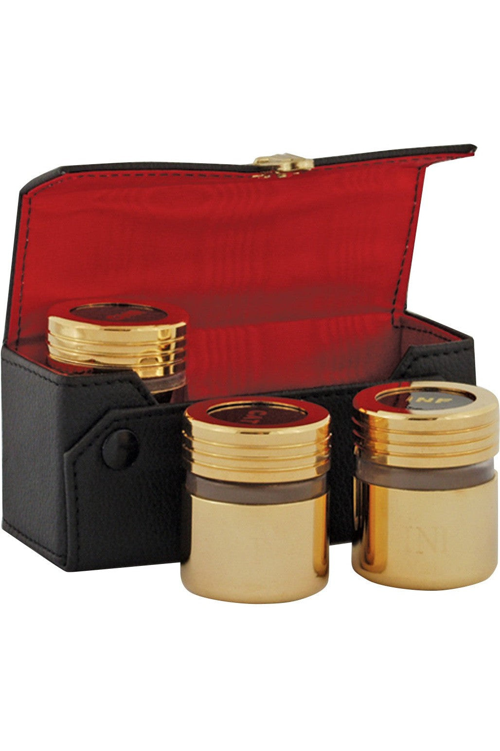 Unit price perThree containers, 24k gold plated. Labeled INF, CHR, CAT. With case.