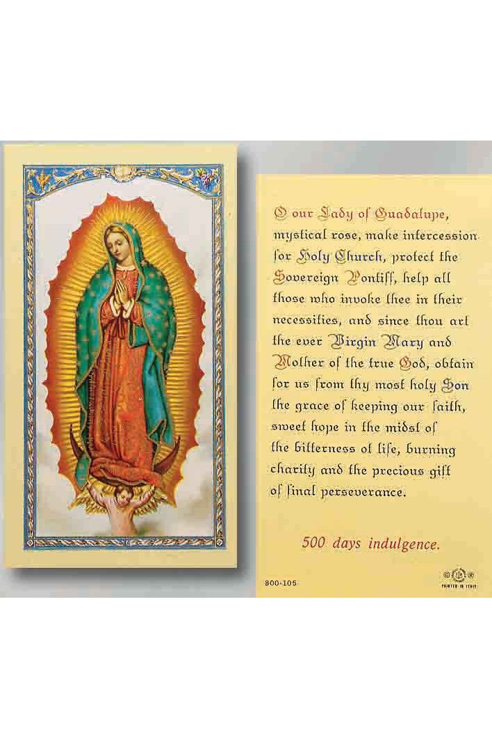 Durable and everlasting laminated holy prayer card that contains a color image of Our Lady of Guradalupe on the front, and the Prayer toO.L. of Guadlupe on the back. Card measures 2 1/2" x 4 1/2".