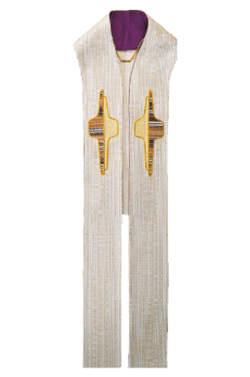 Unit price perReversible overlay stolewith cross in a combination of colorful applique and embroidery in gold and colored threads. Style 75: with stand-up collar.