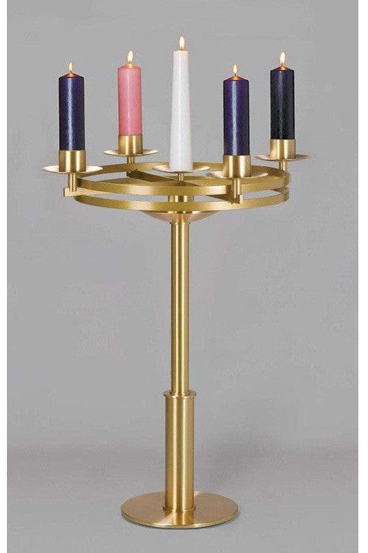 Unit price per26" dia. rings (durable gold powder coated), combination polished/satin bronze finish, all 3" sockets standard, 36 1/2" ht. to paschal bobeche, 41" ht. to Christ Candle bobeche. Candles not included. Please specify paschal socket size, 1 15/16" will be used unless a different size is specified. For paschal sockets over 3" add $55.