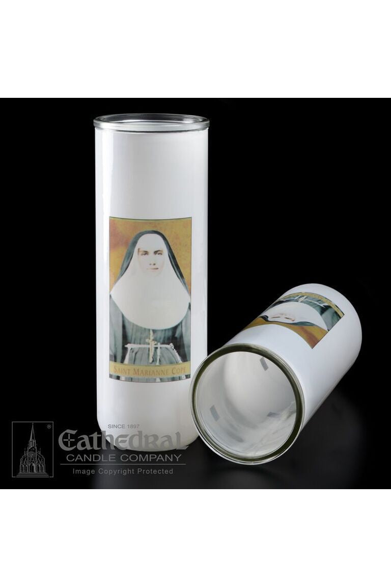 Unit price per5/6/7 day glass candle globes featuring Saint Marianne Cope. Available by the case of 12