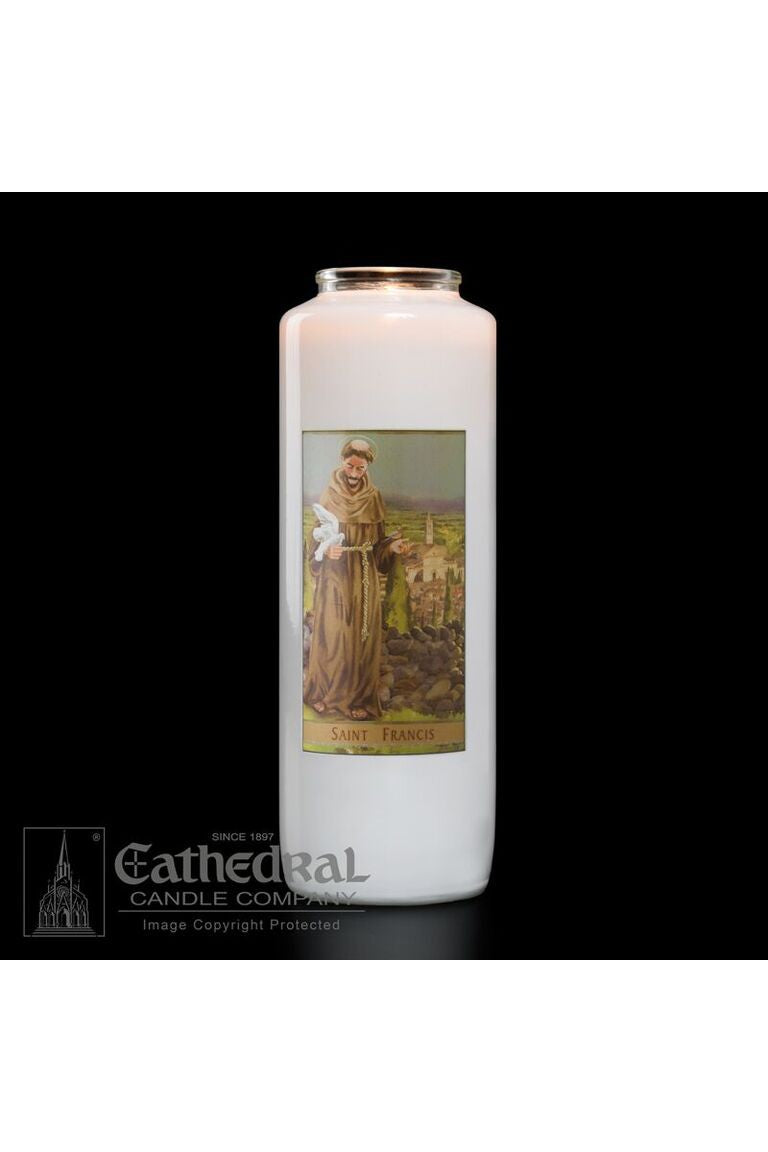 Unit price per6 day glass candles featuring Saint Francis. These candles are intended to remain burning for 6 days.