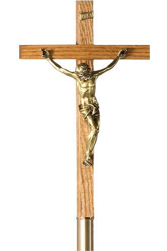 Unit price per89" tall, 2.6 lbs. Combination satin/polished finish, medium oak stain standard. Weighted bases for stability. Cross shown with 2870C Corpus, INRI" included. Arrows indicate separation points in processional pieces.