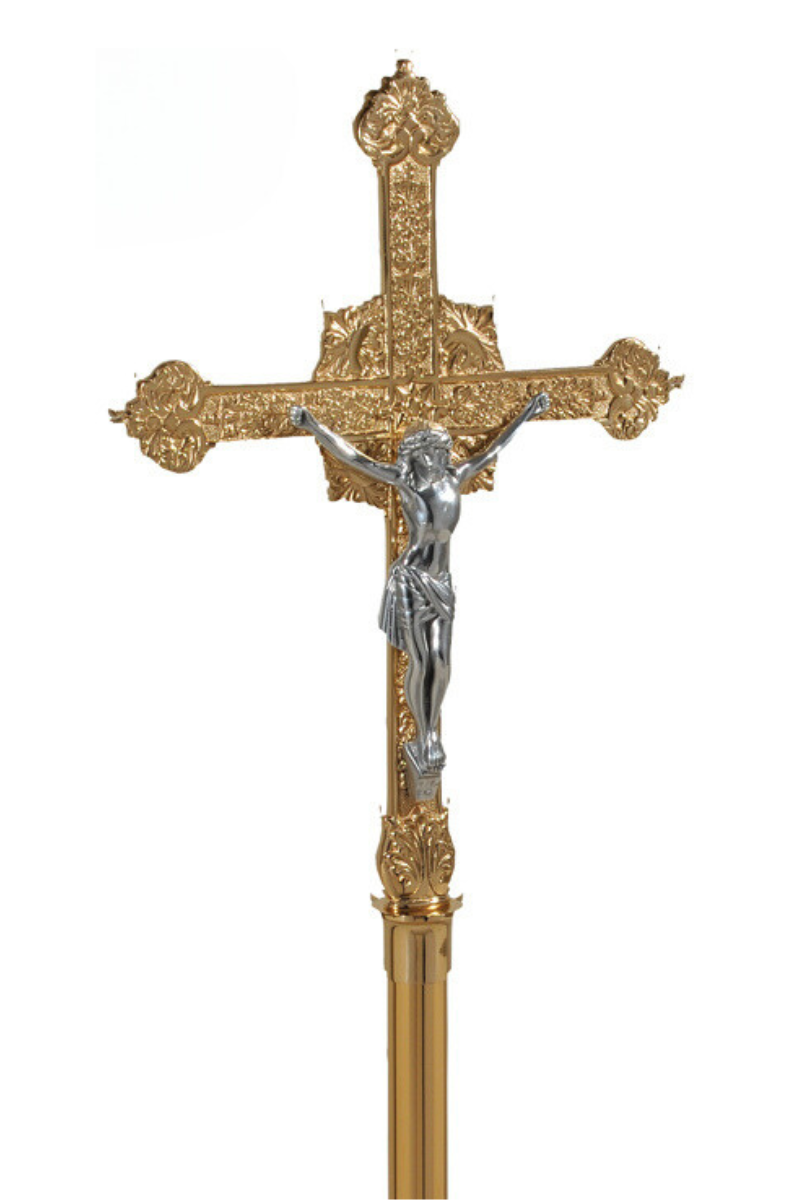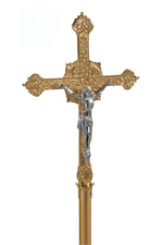 Processional wood cross, 85-1/4" overall height. Satin or high polish bronze finish. Corpus is made of high polish aluminum. Processional tube has baked clear powder coat to prevent tarnishing.