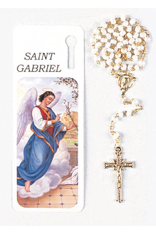 Unit price / perSaint Gabriel color picture bookmark with White beads and gold linked chain, gold centerpiece and gold crucifix.