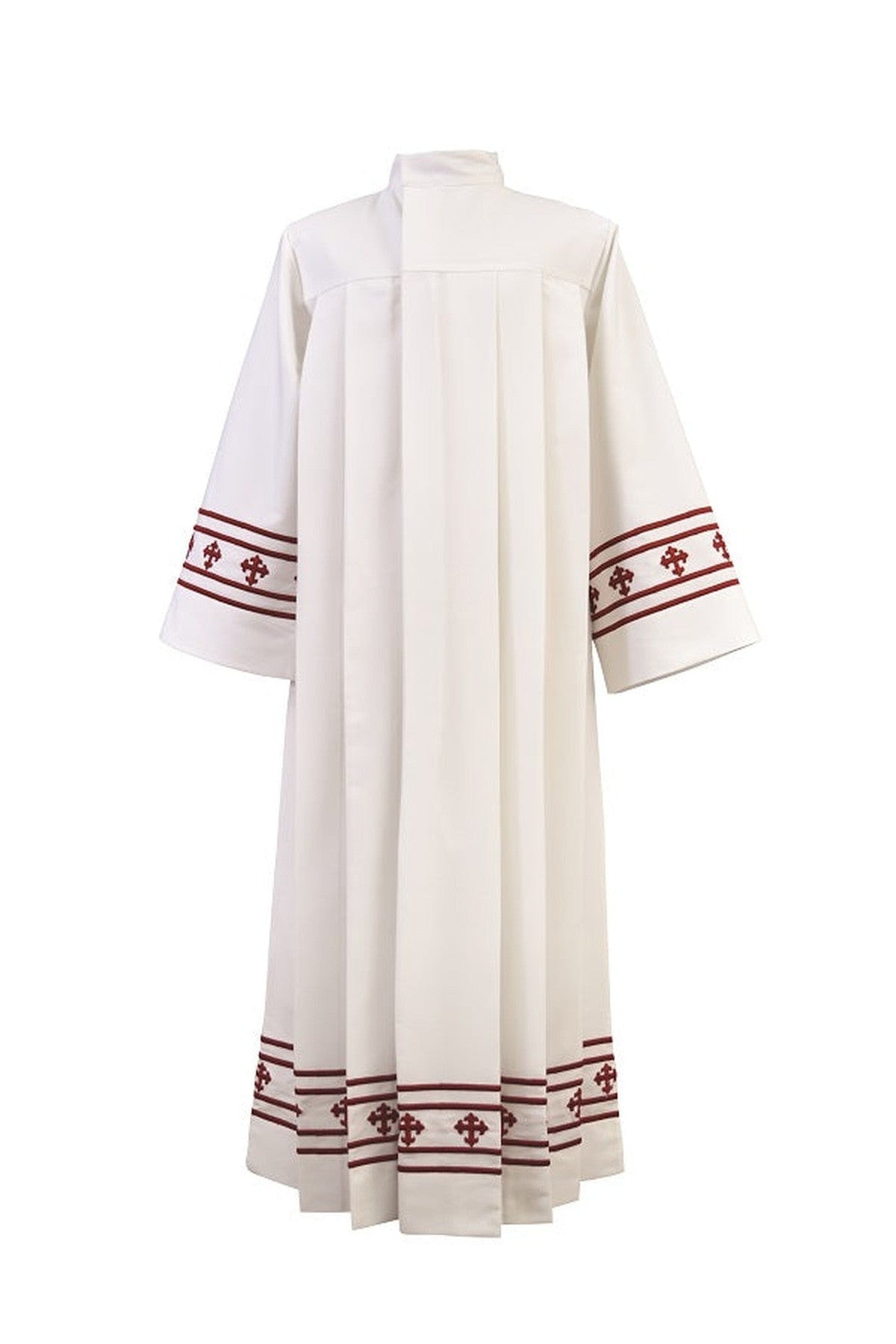 Unit price perA new beginning in contemporary Albs. Designed specifically to meet the requirements of today's Clergy.100% polyester medium weight red embroidery.