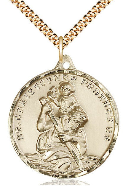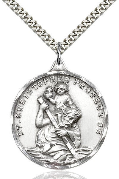 Unit price perSt. Christopher Medal. Heavy 24" Curb Chain. Medal Dimensions: 1 3/8" x 1 1/8". Gift boxed in a velvet box.