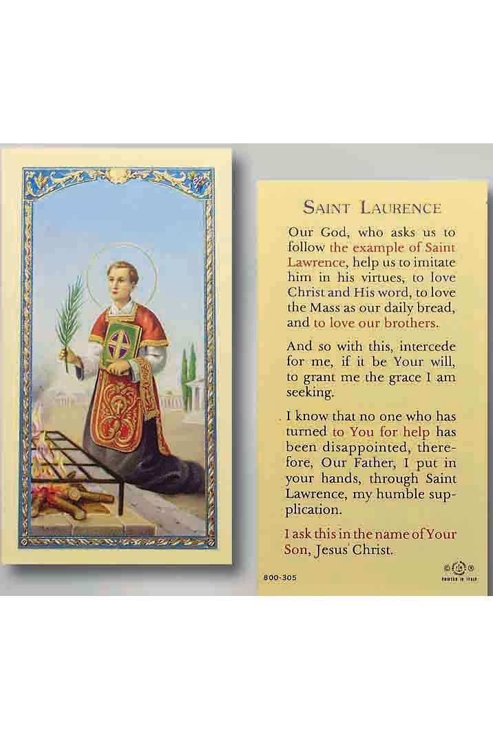 Unit price perDurable and everlasting laminated holy prayer card that contains a color image of St Laurence on the front, and Prayer to St Laurence on the back. Card measures 2 1/2" x 4 1/2".