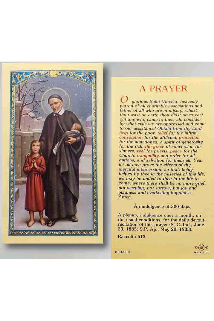 Unit price perDurable and everlasting laminated holy prayer card that contains a color image of St Vincent on the front, and a Prayer for St. Vincent on the back. Card measures 2 1/2" x 4 1/2".