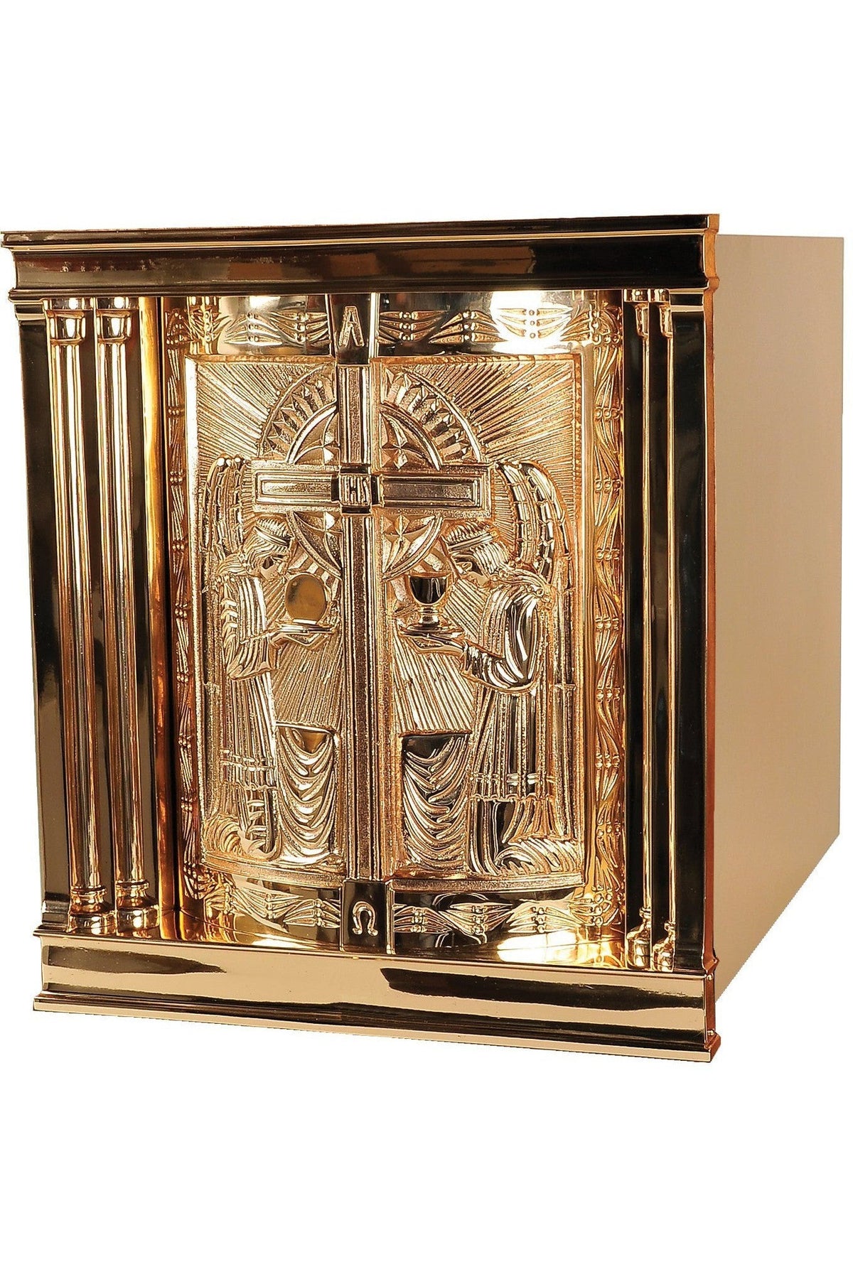Unit price perTabernacle made of bronze with Steel Housings for Insertion into wall cavity. Bas relief sculpted decoration of high polish bronze finish. Interiors lined with white silk fabric and aromatic cedar. Durable Oven Baked Finish. Automatic action doors with vault lock.